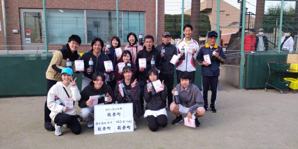 ※選手が手にしている「醤油」は、川口市テニス協会が大会エントリー費に1人¥100ずつ寄付を集め、能登テニス協会に災害支援したお礼の品とのことです。